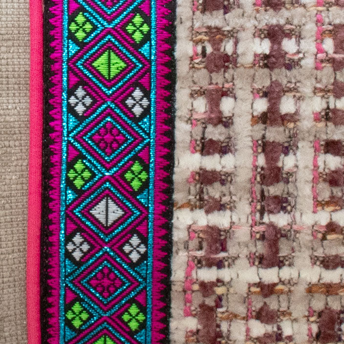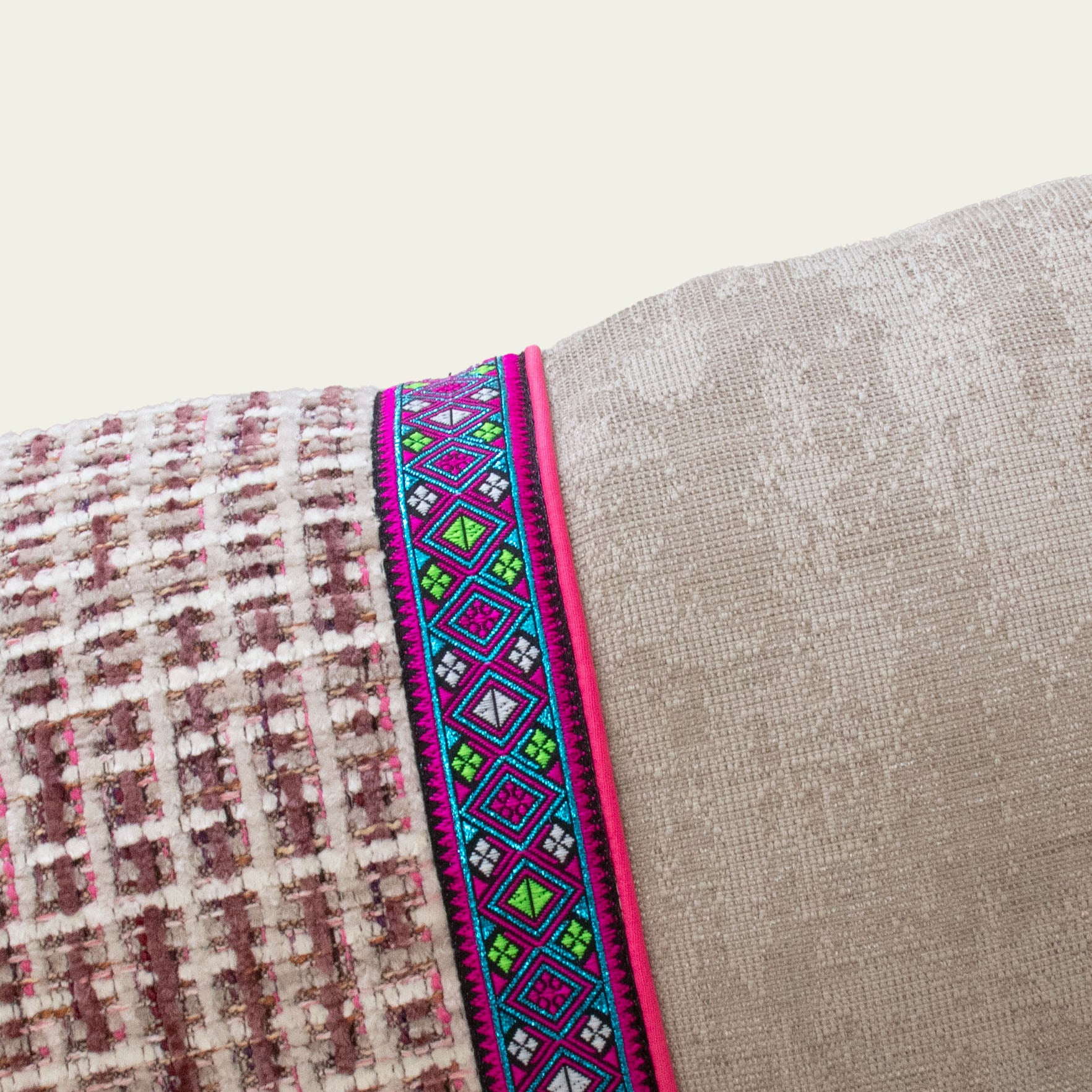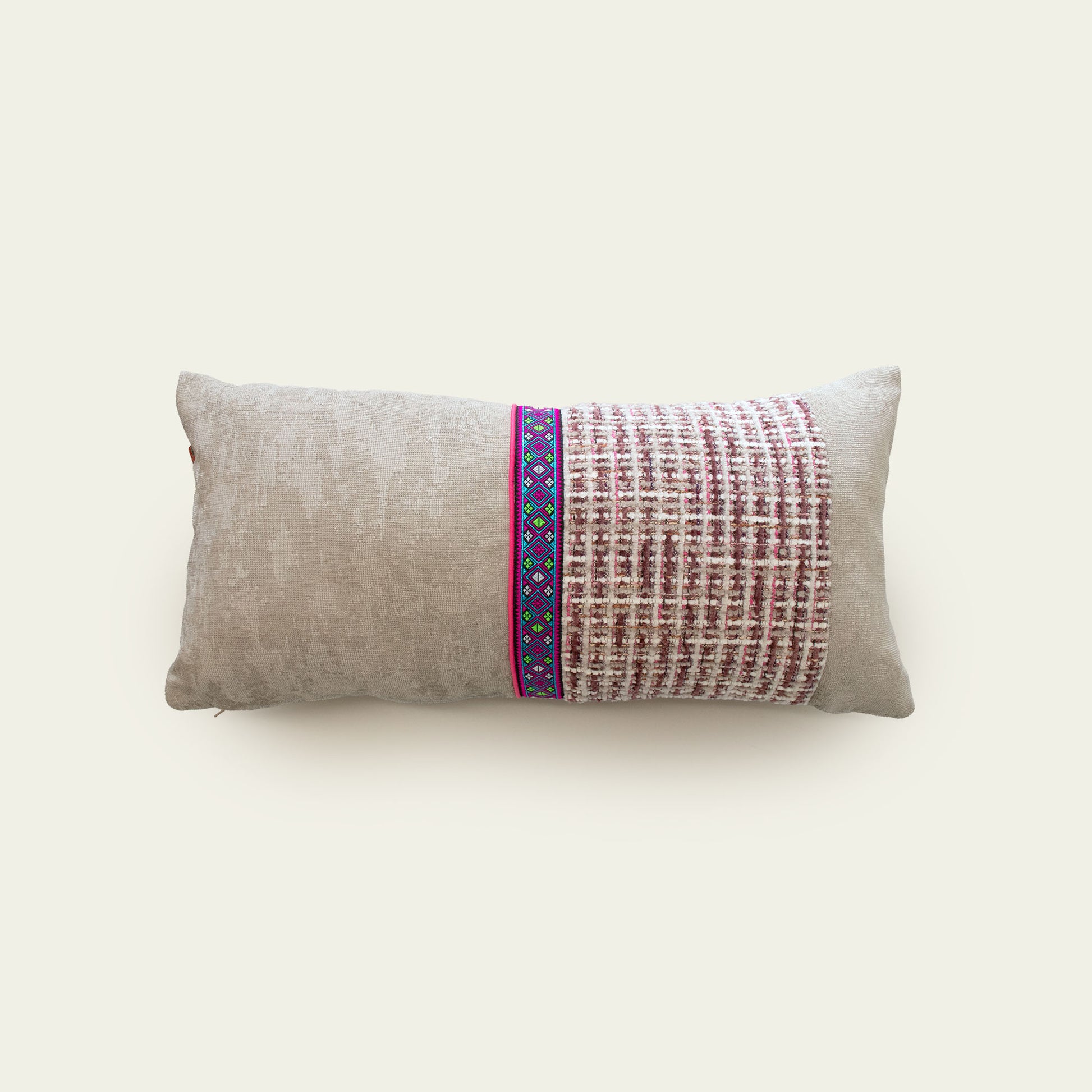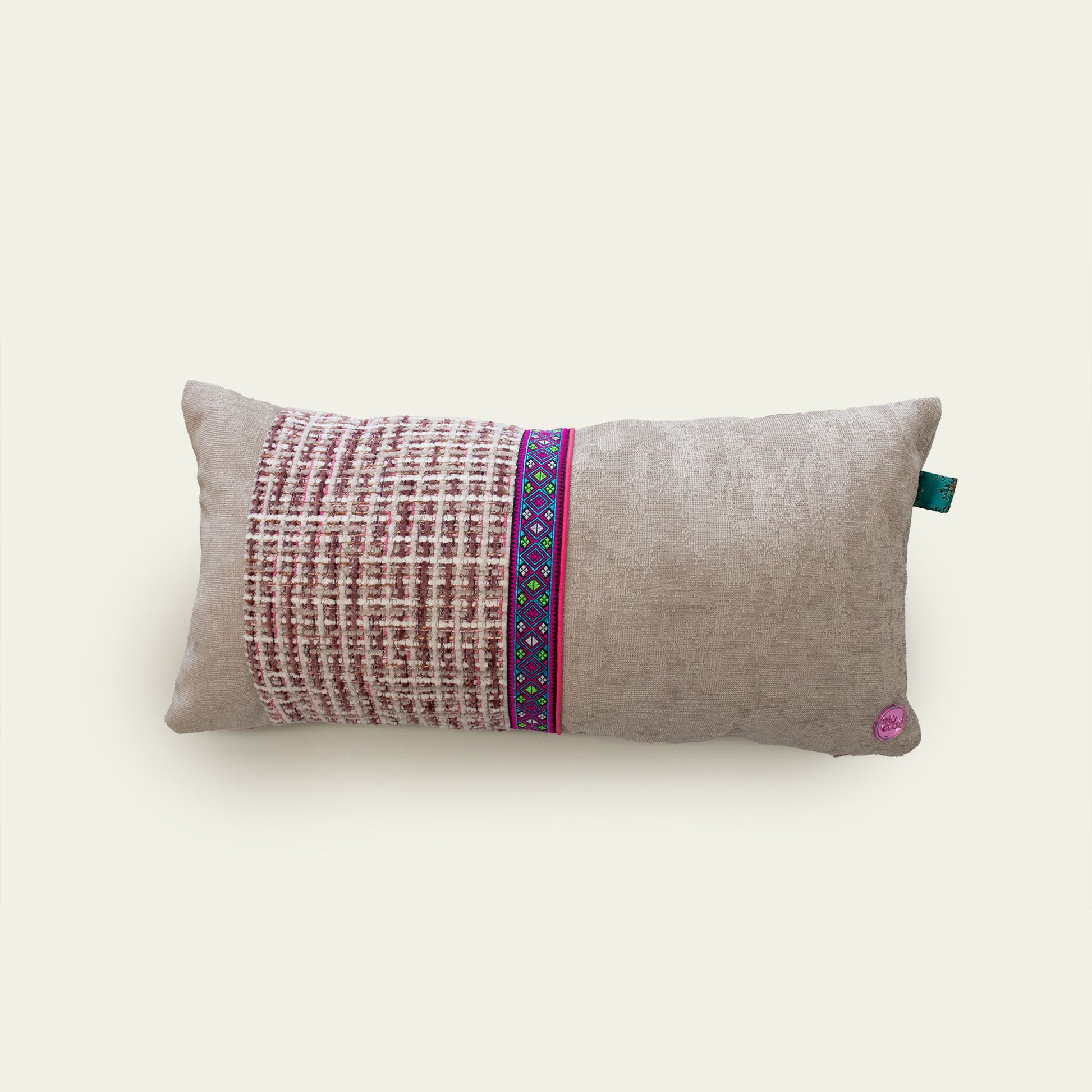 Wat een fijne beauty is dit kussen. Uit de luxe collectie Jadore Lux. De lichtgrijze stof heeft een mooie vleug en naast de warme magnolia geweven baan die over het kussen loopt, geeft het Thaise sierbandje het kussen een extra punch. Leuk om te combineren met een ander kussen uit de Jadore Lux collectie.