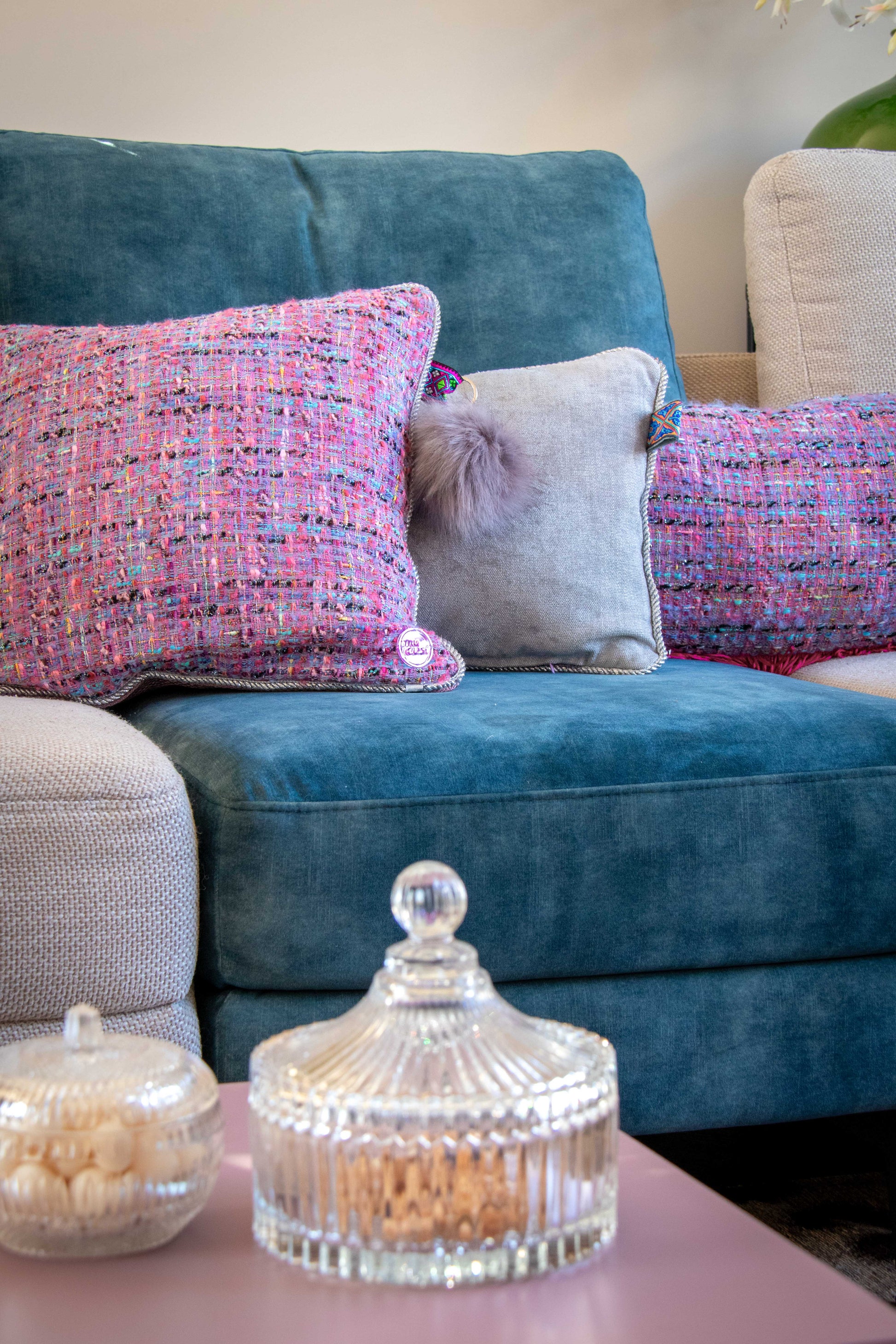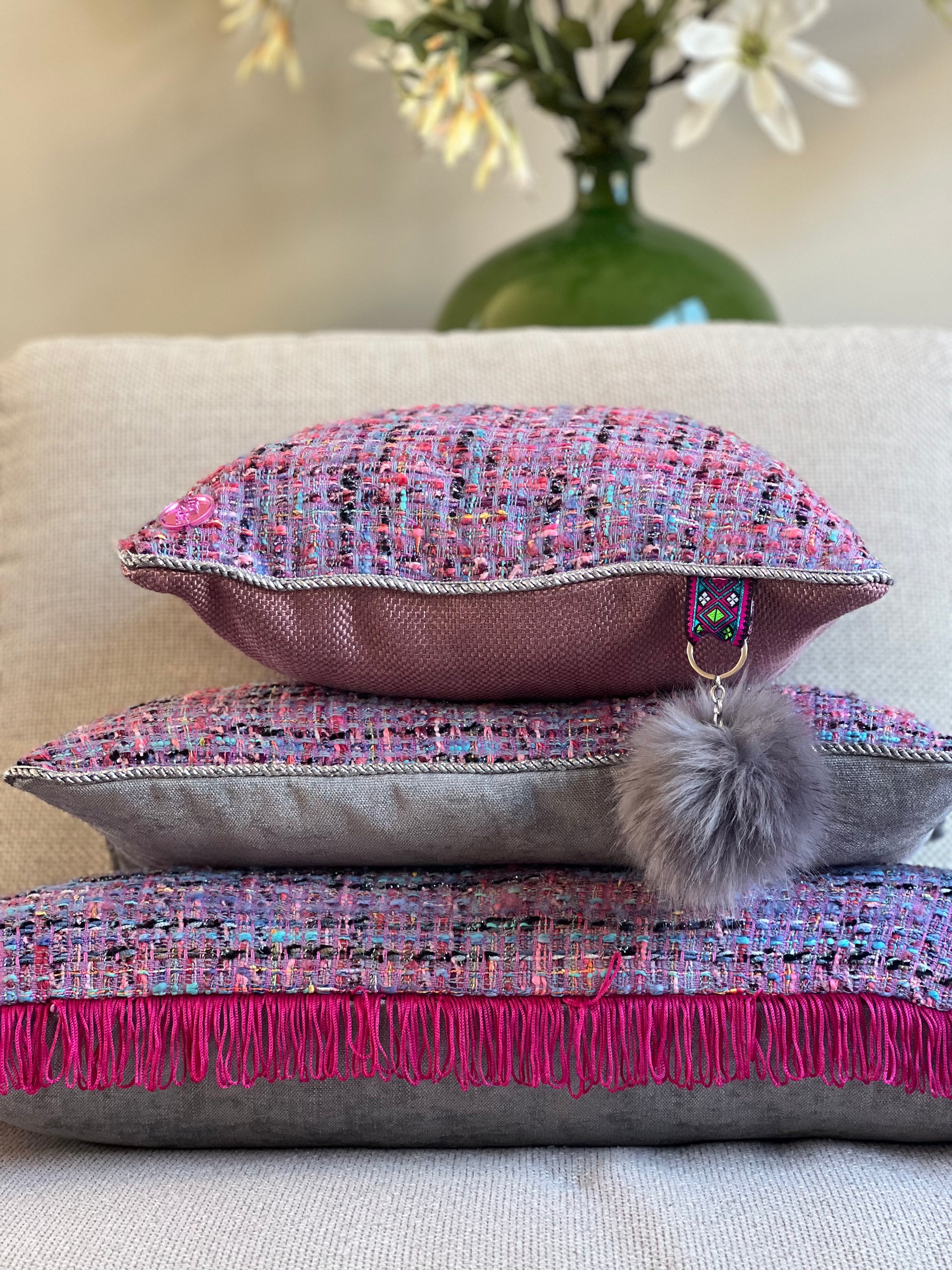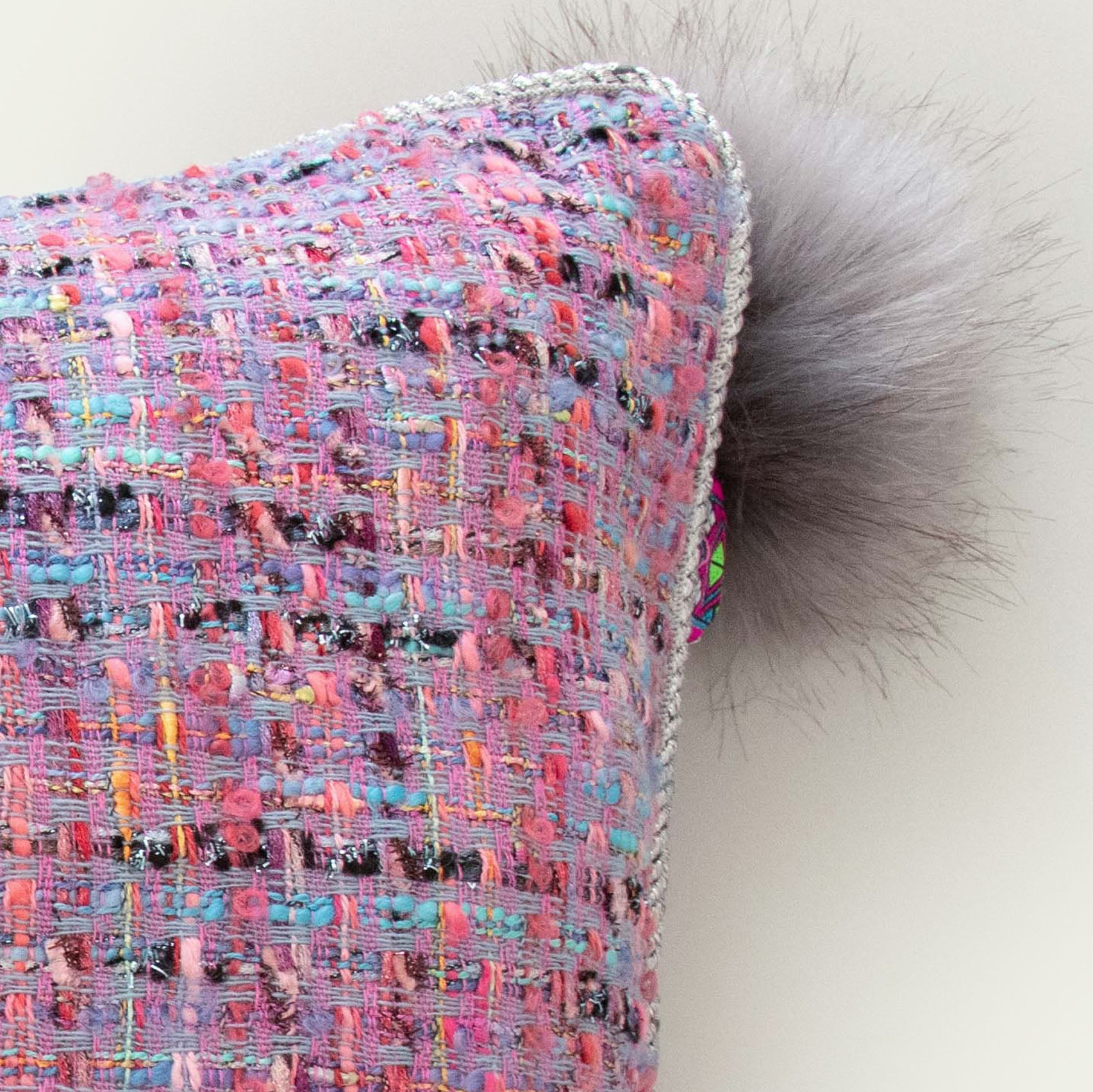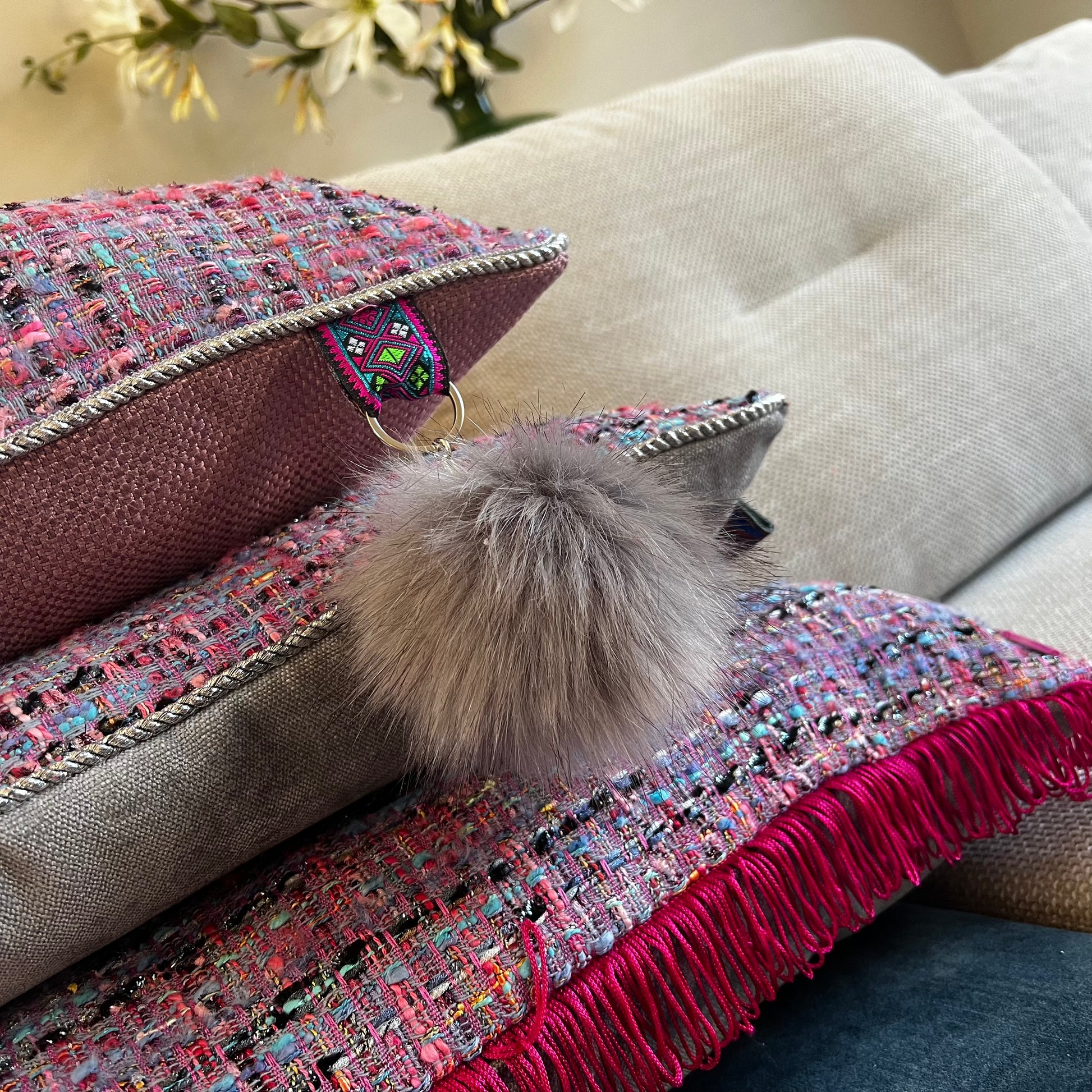 Helemaal volgens de laatste modetrend baseert deze collectie zich op een heerlijke bouclé stof in een lila en roze kleur. Deze Purple Cloud heeft een lichtroze achterkant met een beetje glans, waardoor er een sjieke uitstraling ontstaat. Ook het zilverkleurig gedraaide koord rondom draagt hieraan bij. De grijze pluisbol maakt het echt af, en is in de prijs inbegrepen. Super leuk sierkussen om te combineren met andere Purple Dream kussens.